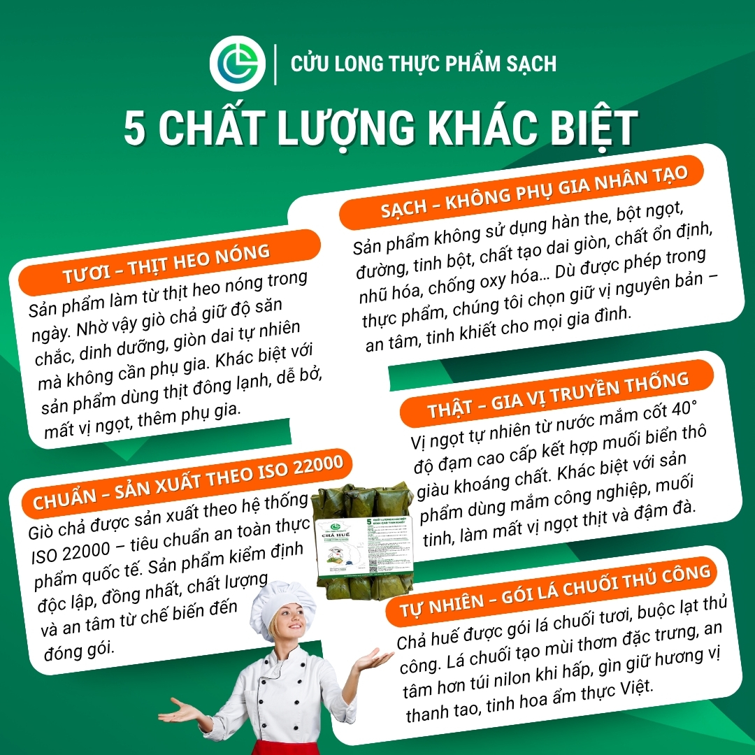 Giò chả được sản xuất theo quy trình tiêu chuẩn quốc tế ISO 22000 (Nguồn:https://www.bsigroup.com/vi-VN/products-and-services/standards/iso-22000-food-safety-management-system/). Tiêu chuẩn này đảm bảo tính đồng nhất cao, từ khâu chế biến giò sống đến khâu gói lá chuối. Quy trình nghiêm ngặt là minh chứng cho chất lượng cao, giúp Chả Huế Cửu Long đáp ứng được yêu cầu khắt khe.