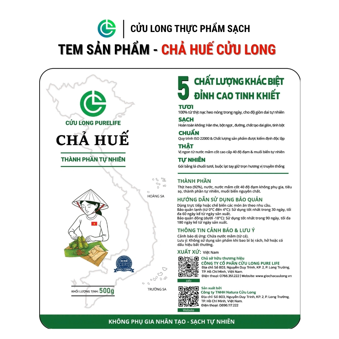 Cửu Long Purelife – Giò Chả Cửu Long (từ 1983) mang đến dòng Chả Huế Cửu Long với công thức gia truyền, nơi thịt nạc nóng được chế biến kỹ lưỡng để đạt độ săn tối đa. hả Huế Cửu Long được phát triển dựa trên 5 giá trị Tinh Khiết: TƯƠI – SẠCH – CHUẨN – THẬT – TỰ NHIÊN, mang lại cảm giác mộc mạc và dễ ăn. Việc sử dụng thịt nạc nóng giúp kết dính protein tự nhiên, tạo độ săn chắc mà không cần phụ gia. Gói lá chuối và gia vị tự nhiên tạo nên hương thơm dễ chịu, thân thuộc với bữa cơm Việt. Nhờ vậy, sản phẩm phù hợp cho nhiều nhóm khách hàng, kể cả trẻ nhỏ và người lớn tuổi.