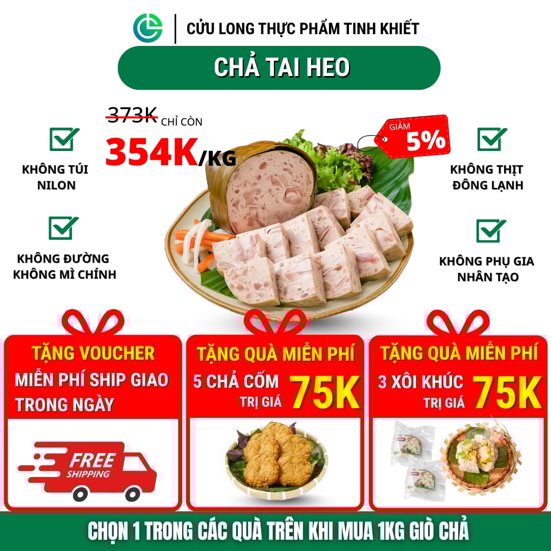 Chả Tai Heo Cửu Long không phụ gia nhân tạo, bao gồm: Hàn the, bột ngọt, đường, tinh bột, chất tạo dai giòn, hay các chất ổn định tổng hợp nào, Cửu Long chọn duy trì vị nguyên bản của giò sống và tai heo. Mặc dù Bộ Y tế cho phép sử dụng các phụ gia này trong thực phẩm với liều lượng an toàn, nhưng Cửu Long chọn hướng đi khác biệt: tập trung vào chất lượng thịt nạc tươi và gia vị tự nhiên để giữ trọn vẹn hương vị. Việc này giúp giảm thiểu nguy cơ tích tụ hóa chất tổng hợp, hạn chế gánh nặng cho gan, thận và hệ tiêu hóa khi sử dụng lâu dài, đặc biệt an tâm cho gia đình.