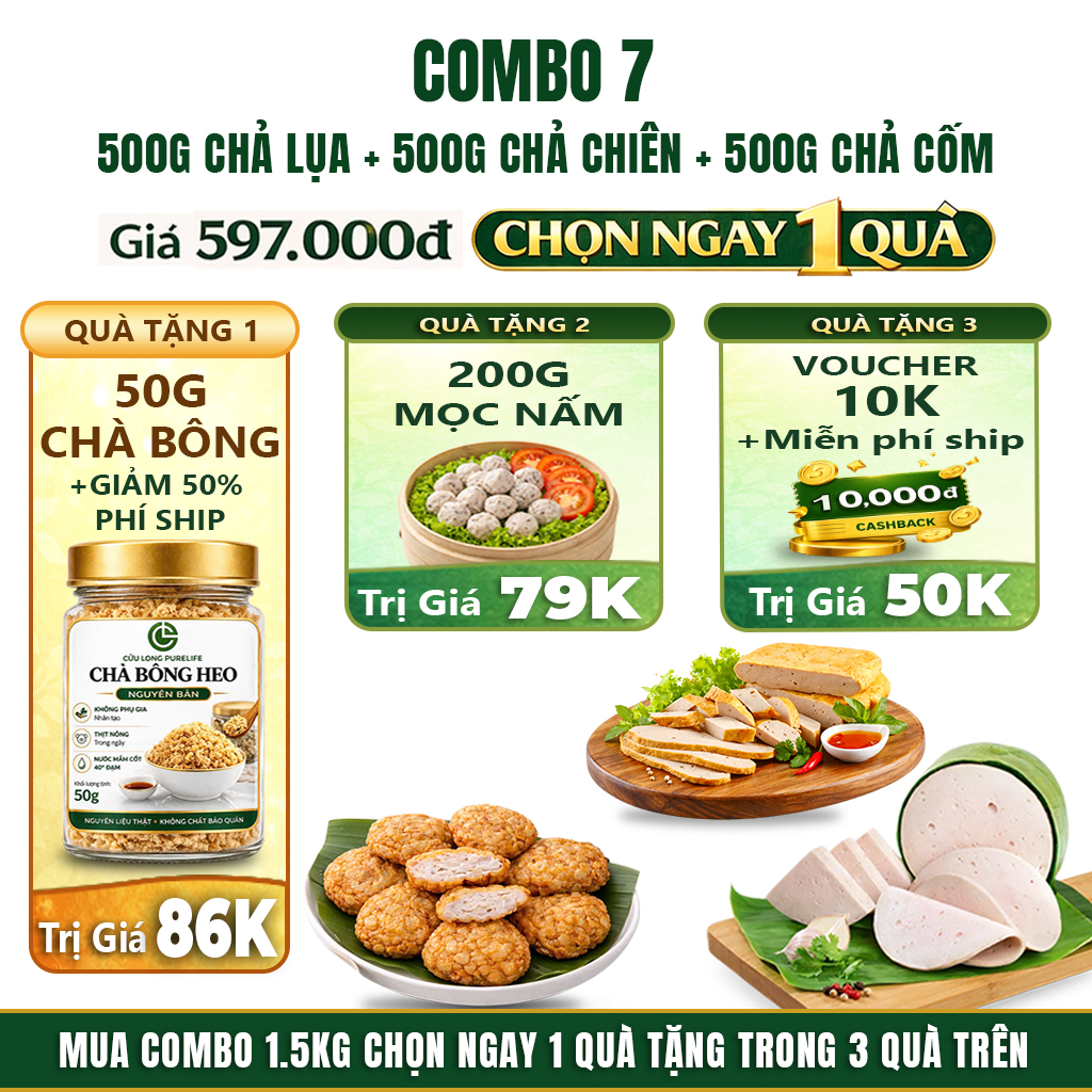 - Combo Giò Chả Ngon Cửu Long mang đến trải nghiệm ẩm thực đỉnh cao với chả lụa (0.5KG) truyền thống, chả cốm (0.5KG) thơm bùi, và chả chiên (0.5KG) đậm đà hương vị lửa. Sản phẩm được chế biến theo bí quyết gia truyền từ năm 1983, đạt chứng nhận ISO 22000, và tuân thủ triết lý "5 KHÔNG" của Ẩm Thực Cửu Long: không túi nilon, không phụ gia nhân tạo, không dùng nước mắm giá rẻ, không thịt nạc đông lạnh, không bán hàng tồn cũ. Đây là lựa chọn đáng tin cậy cho bữa ăn sạch, ngon miệng, phù hợp với chế độ ăn sạch cho gia đình và trẻ nhỏ, đặc biệt tại TP. Hồ Chí Minh và trên toàn quốc.