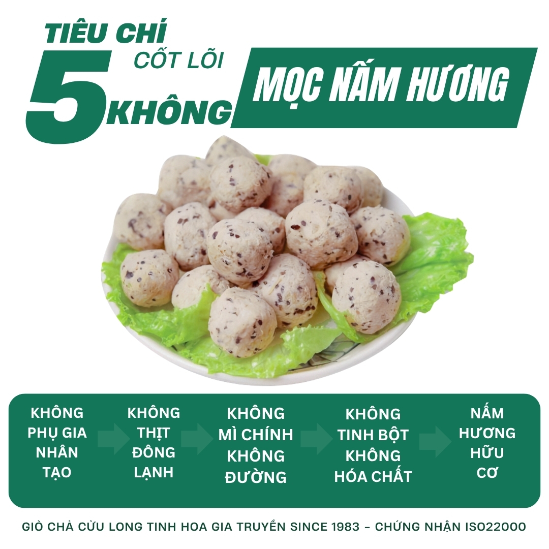 - Kiểm Soát Chất Lượng: Giò sống được sản xuất theo quy trình tiêu chuẩn quốc tế ISO 22000 (Nguồn: https://www.bsigroup.com/vi-VN/products-and-services/standards/iso-22000-food-safety-management-system/). Tiêu chuẩn này đảm bảo tính đồng nhất, từ khâu trộn nấm hương sạch vào giò sống nấm hương đến khâu đóng gói.