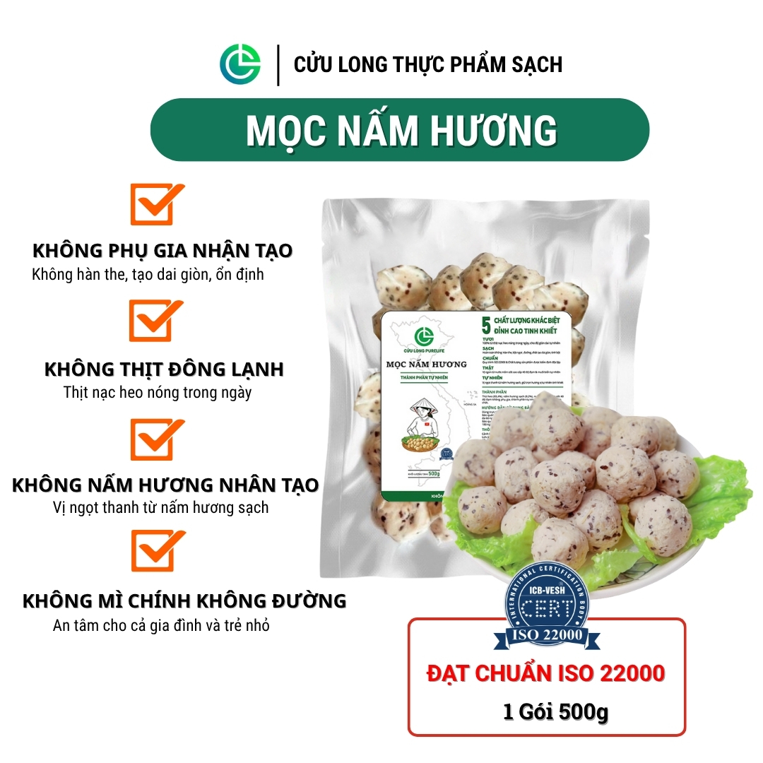 - Tiêu Chuẩn Loại Bỏ: Mọc Nấm Hương Cửu Long hoàn toàn không phụ gia nhân tạo, bao gồm: Hàn the, Polyphosphate, Bột ngọt (MSG), tinh bột độn, chất tạo dai giòn, chất ổn định, chất làm dày, chất nhũ hóa, chất giữ ẩm hay chất chống oxy hóa, hương liệu tổng hợp.